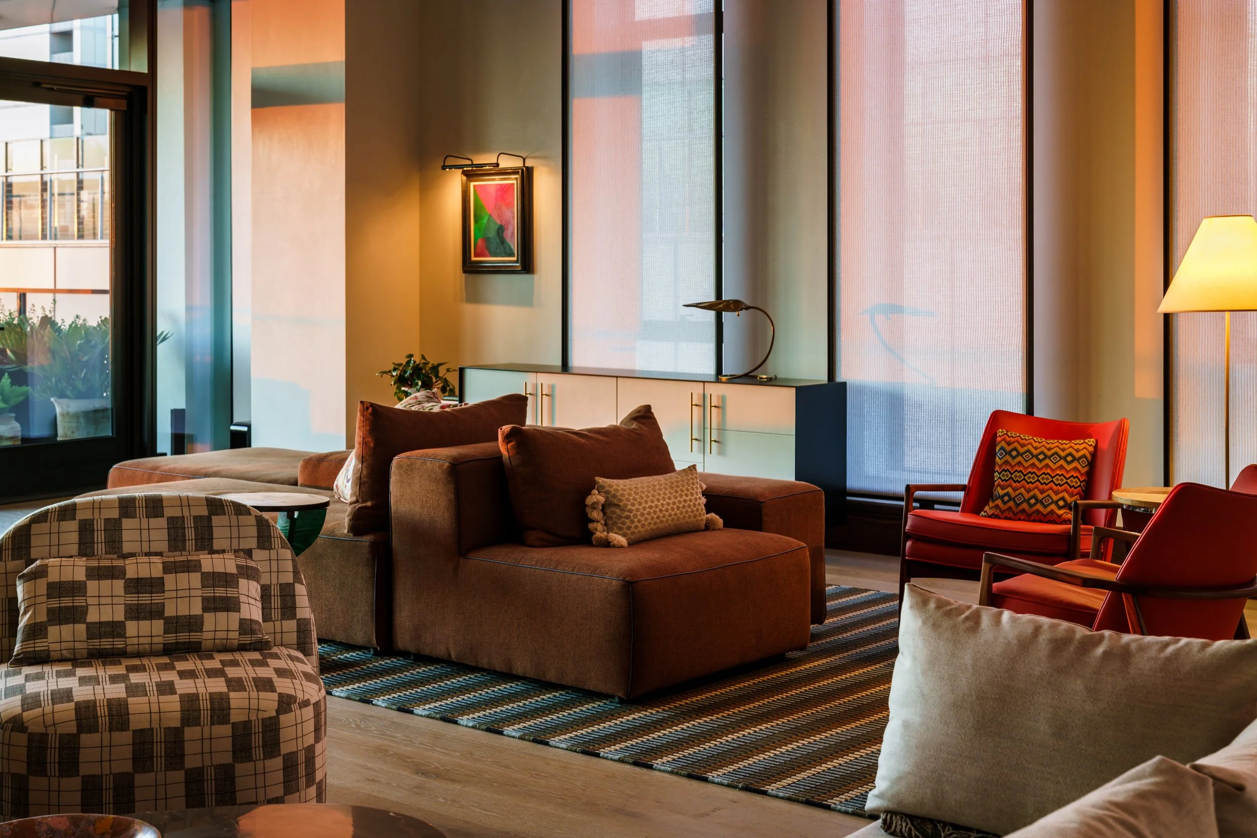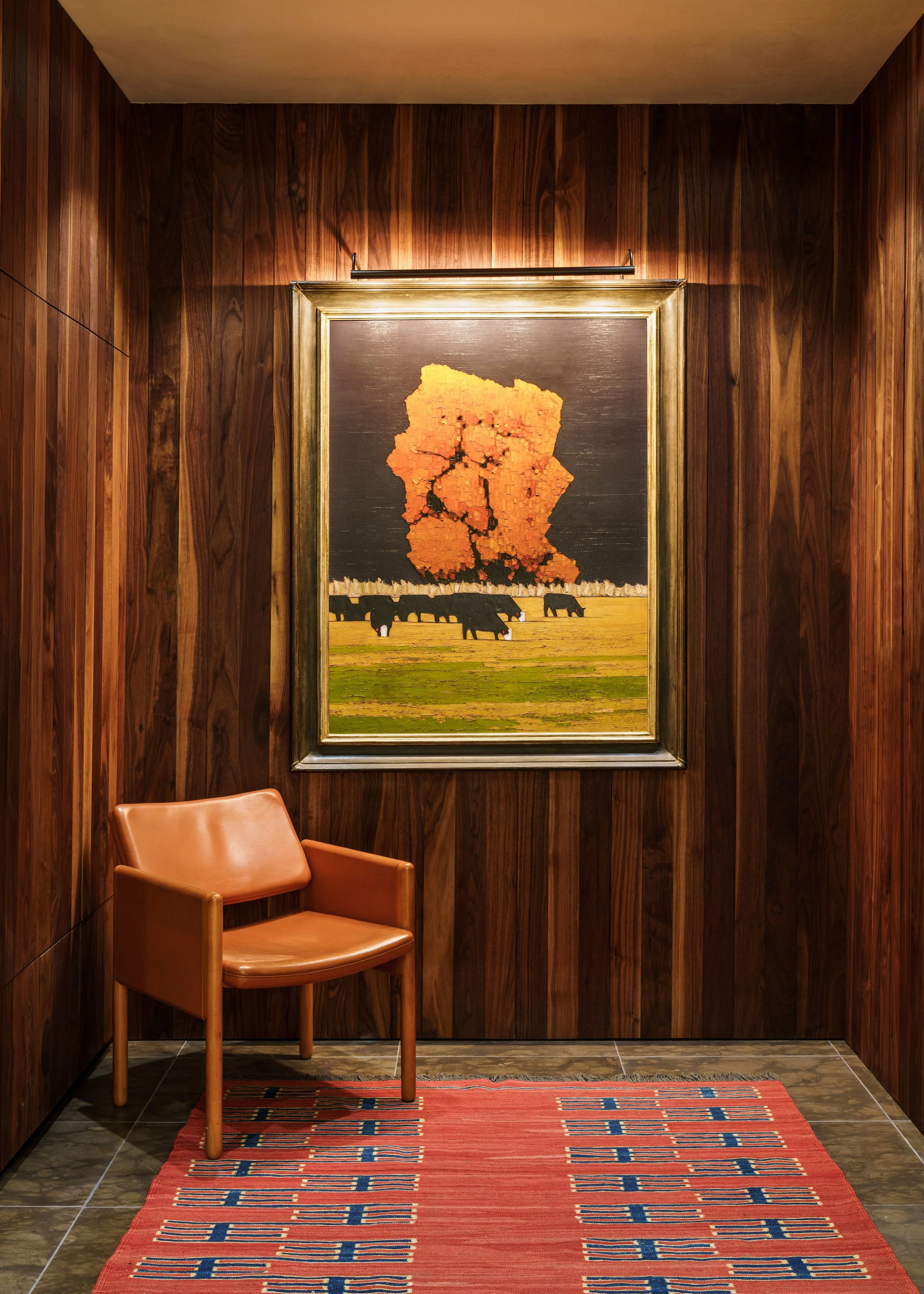 This light and playful room is surrounded by glass on three sides, the only solid wall hides the unit’s mechanical systems with floor-to-ceiling Shinnoki wood paneling that incorporates a wine wall and pull-out bar as you experience Austin from a priceless vantage point. The second floor is where the family’s private space and sleeping quarters are. Past the custom walnut bookcase at the top of the landing await cozy nooks to read and take in the city view, a colorful and joyous family room, and a bespoke colored glass and steel entry to the primary suite. Previously the owners had lived part-time in Jackson Hole, Wyoming, so recreating that beautiful mountain warmth in a downtown high-rise meant everyone was thrilled with this showstopper penthouse.