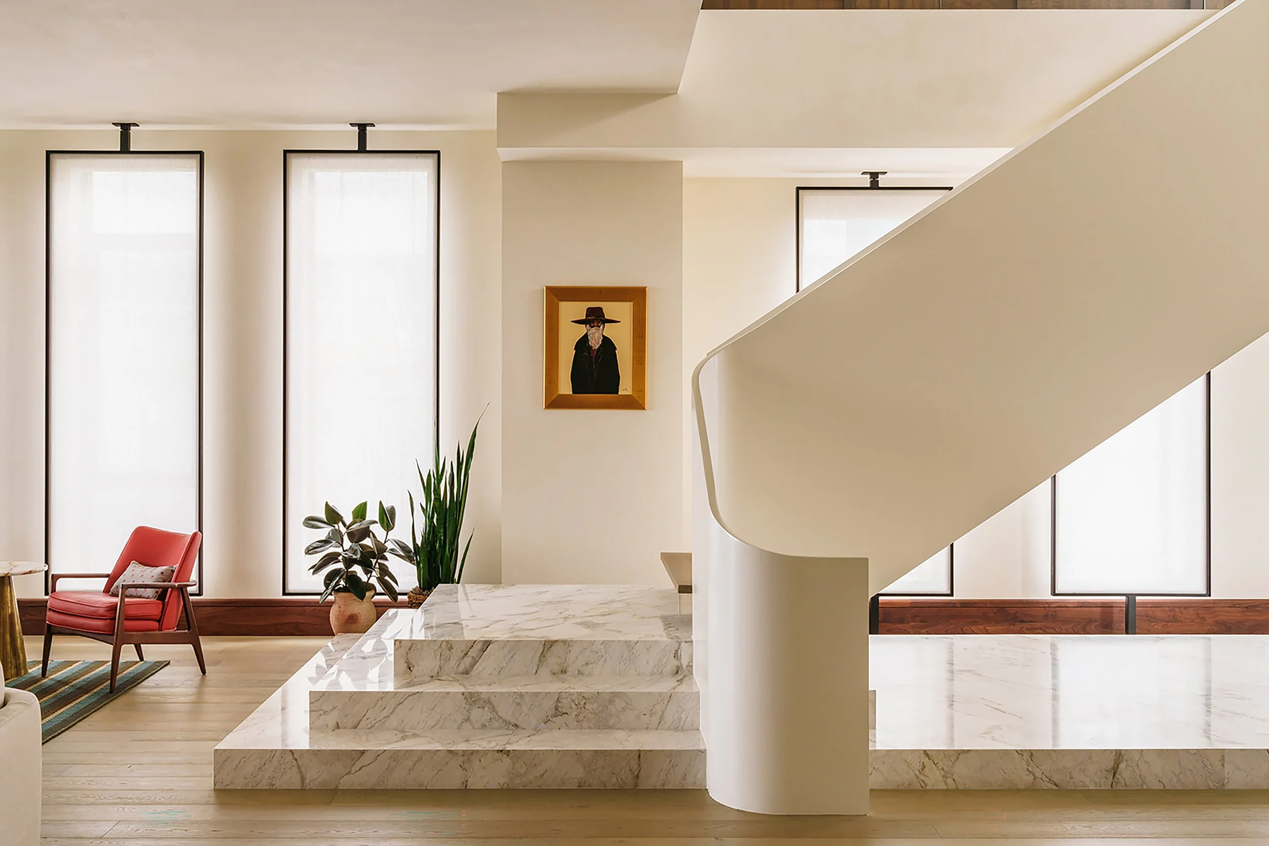 The kitchen, living, and dining room is all one open space on the public level. To elevate the kitchen and differentiate it from other units in the building, the upper cabinets were updated with steel and fluted glass fronts to tie in with the new dark Port Laurent marble now covering the countertops, backsplash, and monolithic island.
