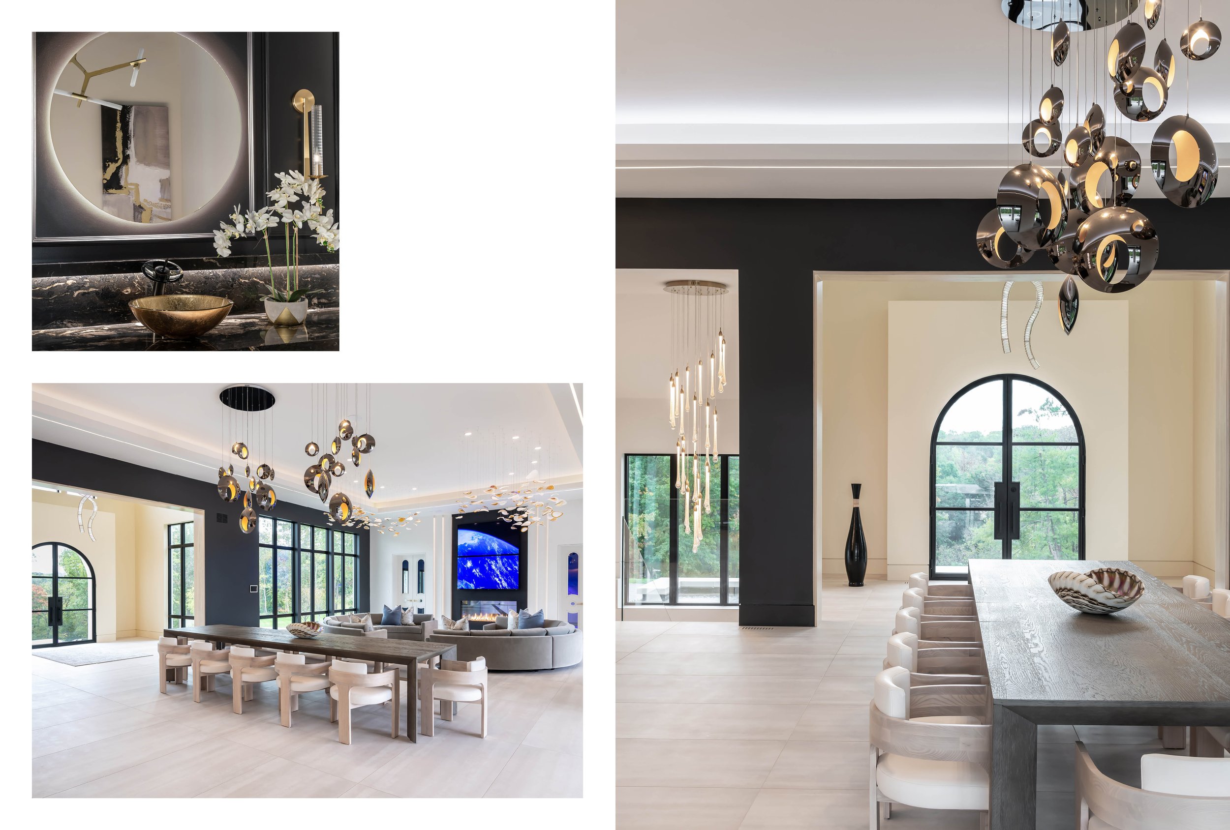 Throughout the home, lighting is treated not just functionally but as artwork in its own right. In the primary bathroom, for example, tulip-shaped glass pendants add elegance and whimsy, complementing one of the home’s most unique features: shower doors that open directly to the outdoors.