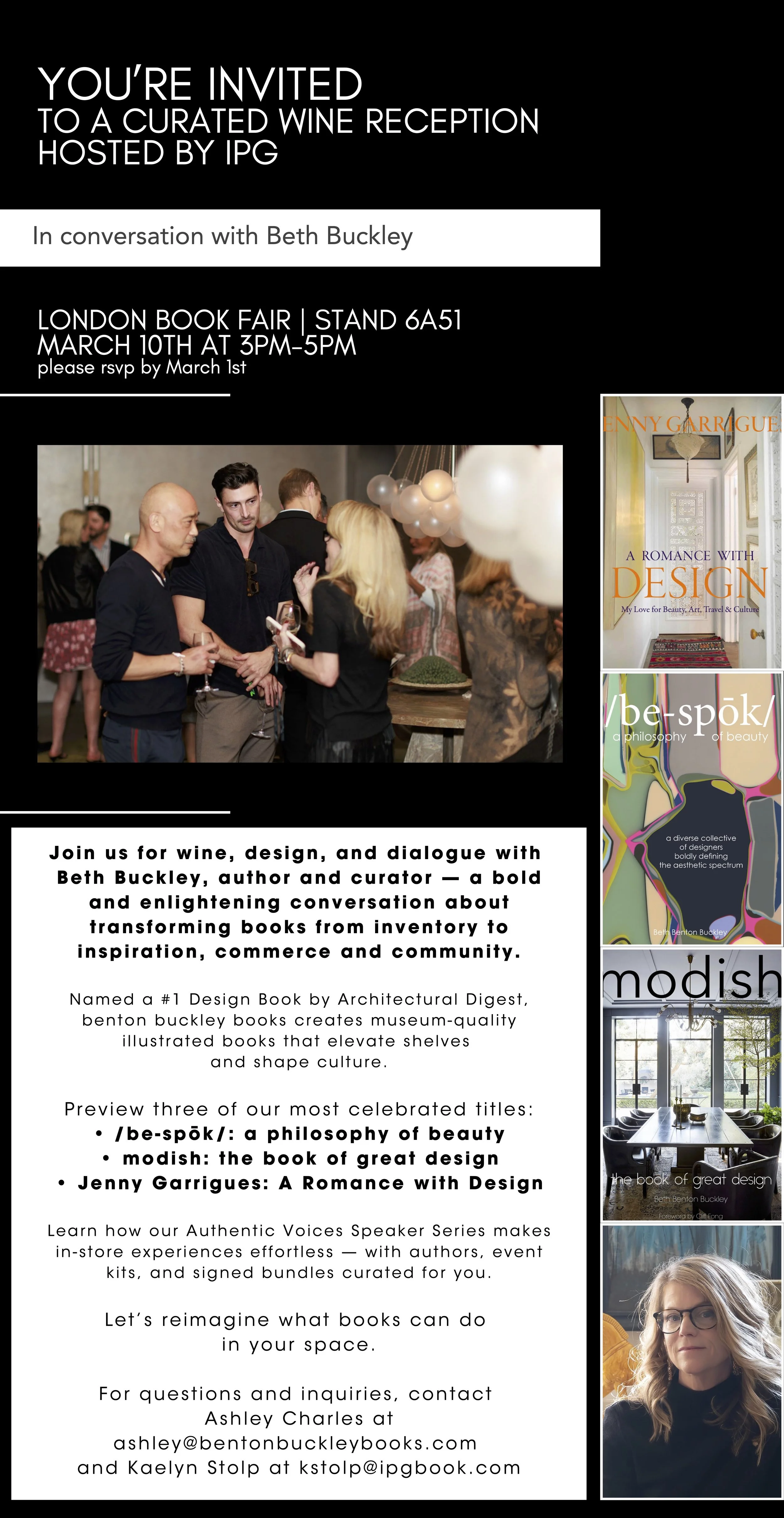 Join us at the London Book Fair for an intimate, curated reception hosted by IPG, in conversation with Beth Buckley — founder and principal publisher of benton buckley books. Amid the hum of the fair and the fragrance of fresh pages, we will explore what it means to transform books from mere inventory into inspiration, into community, into art.